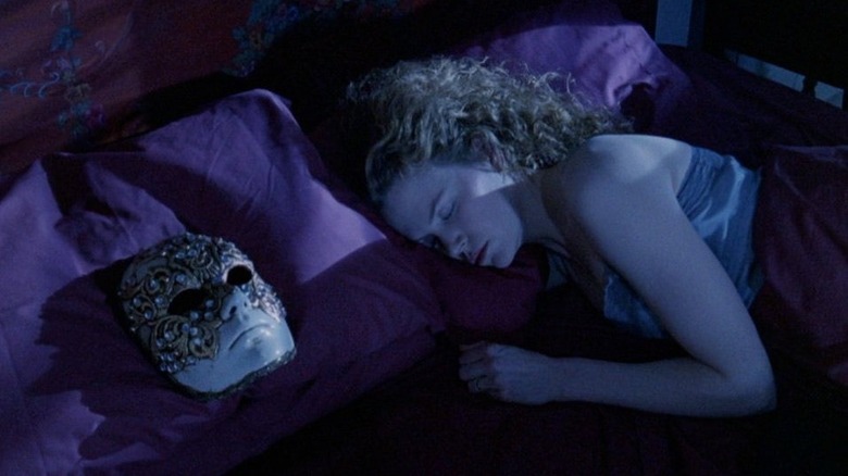 In one of the final scenes, Bill sees the mask on his pillow beside his sleeping wife. The object that shields the truth sits in clear view, causing him to break down and reveal to Alice the details of his journey. But who left it there? There are three popular theories, several of which are detailed by ScreenRant. The first is that Alice found the mask and left it out in order to provoke a confession. In line with the film's illusory mood, the mask could also be an imagined indication that Bill's brush with infidelity would always haunt him. Or perhaps members of the nefarious secret society placed it there as a threat. What matters more than who put it there is why it's there: as a bold reminder of how Bill hides from what is real.
