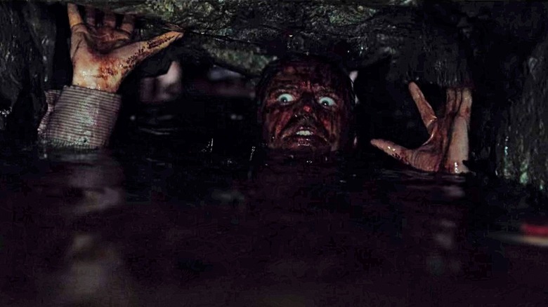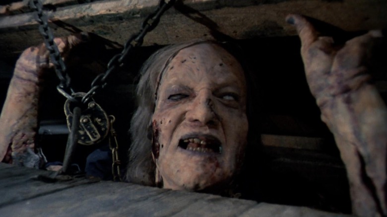 Imagine being encased by latex, in North Carolina's heat, for multiple hours a day on a film set where high-powered lights and other production elements increase temperatures. That was Ted Raimi's curse during his scenes as Henrietta in Sam Raimi's "Evil Dead II," where he played a historian's demonically-possessed wife. Ted's body sweated literal buckets of salty runoff into the deadite's full-body costume, which was reported to collect liters' worth of bodily liquid. Don't believe me? Watch carefully when Henrietta spins around over Annie's head, and you'll see perspiration dripping out of the monster's ear and info frame.