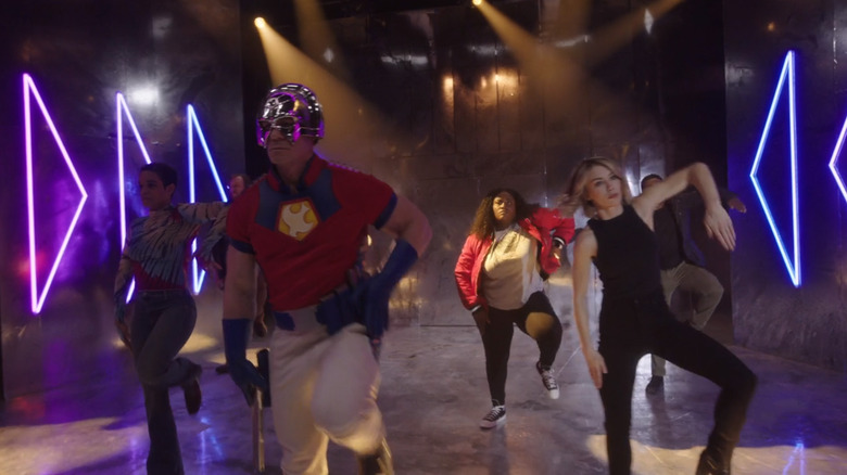 According to "Peacemaker" star Jennifer Holland, Charissa took Gunn's concept of a surreal and robotic dance with the actors remaining emotionless, and crafted the piece from there. The actors would work with Barton on the days they weren't filming, and the opening sequence was shot with the entire cast together in the same room: a high school auditorium. Most of the cast of "Peacemaker" are not the strongest dancers, and Barton's choreography was clearly constructed with everyone's varying skill level in mind. Throughout the press tour of the show, most of the actors have agreed that the hardest part was not the actual choreography, it was performing it with a straight face. Just as this is not your typical superhero series, this isn't your typical opening dance number, either. They're not hamming it up for the crowds in the nose-bleeds, this is serious business.
